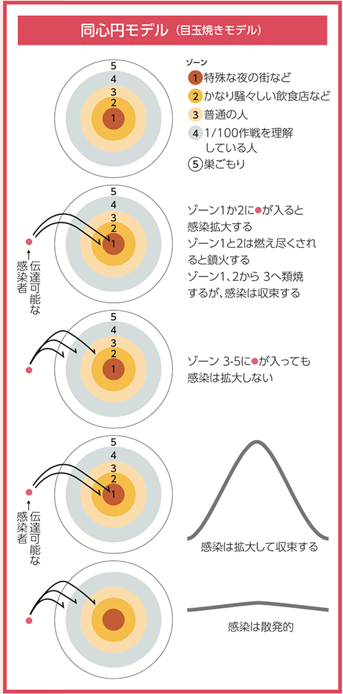 この同心円を五つのゾーンに区分けします。@は特殊な夜の街に通う人など、Aはかなり騒々しい飲食店を利用する人など、Bは普通の人、C100分の1作戦を理解している人、Dは巣ごもりの人を指します。@Aが黄身の部分で、BCDが白身の部分です。