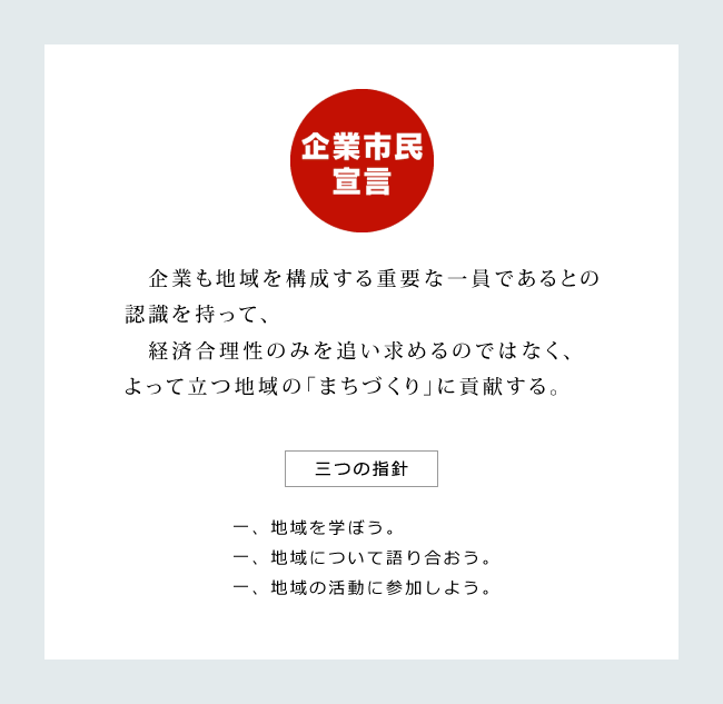 「企業市民宣言の会」は、金沢経済同友会提唱の企業市民宣言に賛同する企業・団体等による組織で、金沢経済同友会・企業市民会議内の「企業市民宣言の会 運営委員会」が運営しています。企業も地域を構成する一員であるとの認識を持ち、地域の「まちづくり」に貢献するために活動しています。